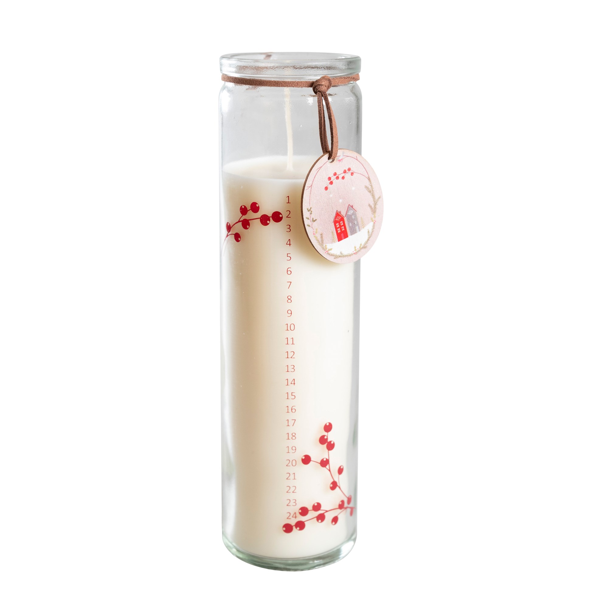 Adventná sviečka/kalendár v skle V.21cm biela s potlačou