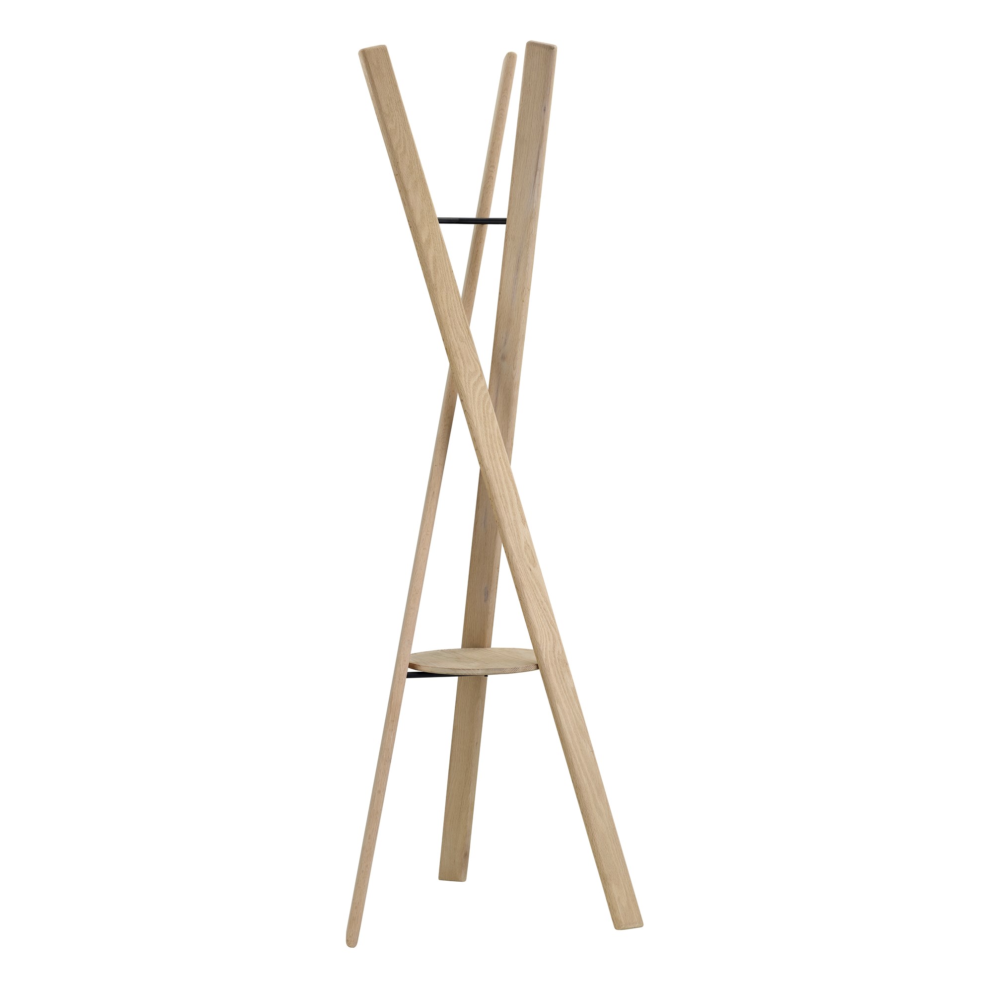 Vešiak na kabáty RAKKU je k dispozícii v prírodnom alebo čiernom dube a dodáva sa kompletne zmontovaný.