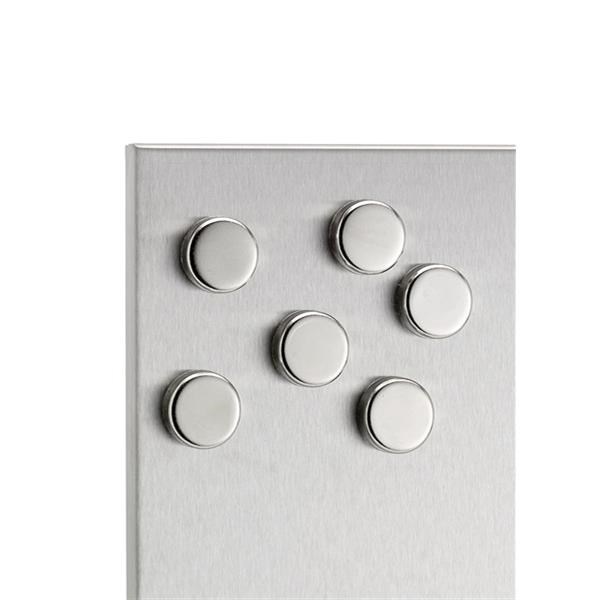 Sada 6 magnetov MURO, prezentovaná v elegantnom štýle, je vyrobená z nerezovej ocele. Skvele sa hodí k magnetickým tabuliam MURO.