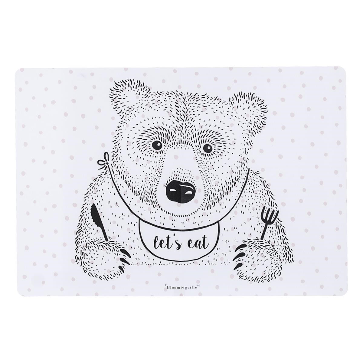 Roztomilé prestieranie v bielej farbe so svetlo ružovými bodkami a veľkým čiernym potlačou medveďa s nožom a vidličkou v ruke a podbradníkom s textom „Let´s eat“ / „Poďme jesť“. Prestieranie od Bloomingville má obdĺžnikový tvar a je vyrobené z praktického plastu, takže sa ľahko čistí.