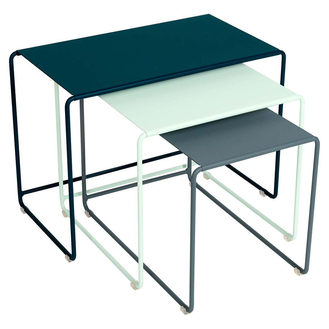 OULALA! PÁNI! Taká bude určite vaša reakcia pri pohľade na náš set nízkych stolov. Ako už názov napovedá, OULALA sa skladá z troch nízkych stolíkov rôznych geometrických tvarov a výšok. Dva obdĺžnikové stoly (55x30xv40 a 50x30xv34) a štvorcový stôl (40x40xv37) je možné zasunúť pod seba alebo ich usporiadať v mnohých možných kombináciách. Môžu byť použité samostatne alebo spoločne: na konci pohovky, rozmiestnené okolo obývacej izby alebo ako konferenčný stolík. Hrajte sa s nimi! Táto trojica ukazuje vynaliezavosť štúdia Fermob a jeho francúzske výrobné znalosti. Stoly sa skladajú zo zakrivenej základne z oceľového drôtu a dosky z oceľového plechu. Naše štýlové stolíky OULALA, navrhnuté na použitie vonku, sú ale tiež vhodné na použitie vo vnútri! Inovatívne, šikovný a praktický produkt na použitie kdekoľvek vo vašej domácnosti: kto by mohol chcieť viac? Set stolov je k dispozícii v ultratrendových farebných kombináciách. Zodpovedajúce odtiene dodajú vášmu vonkajšiemu priestoru grafický nádych, ktorému bude ťažké odolať. Existuje len jedno slovo: "Oulala!"