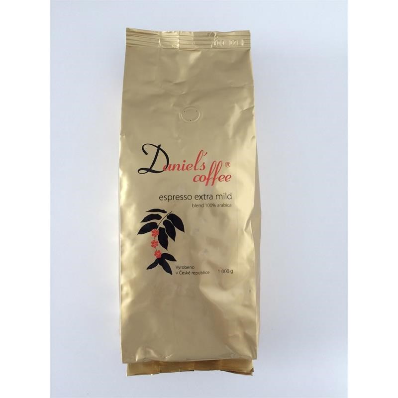 Čersstvo pražená zrnková káva Daniel´s coffee espresso extra mild - pripravená zo 100% káv druhu arabica. Jednotlivé druhy sú zo Strednej a Južnej Ameriky, Afriky a Ázie. Pochádza z českej pražiarne kávy s 25-ročnou tradíciou, ktorá si zakladá na tom, aby každému zákazníkovi bola dodaná vždy čerstvo upražená zmes. Špeciálny spôsob praženia dáva káve výraznú, ale jemnú chuť, ktorú ocenia milovníci dobrého espressa.